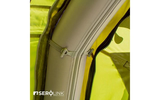 Ein lichtreflektierendes Material innerhalb der Schlafkabine sorgt für ungestörten Schlaf. Die abgewinkelte Balkenkonstruktion bietet sowohl verbesserte Windstabilität als auch angenehme Stehhöhe im gesamten Zelt.